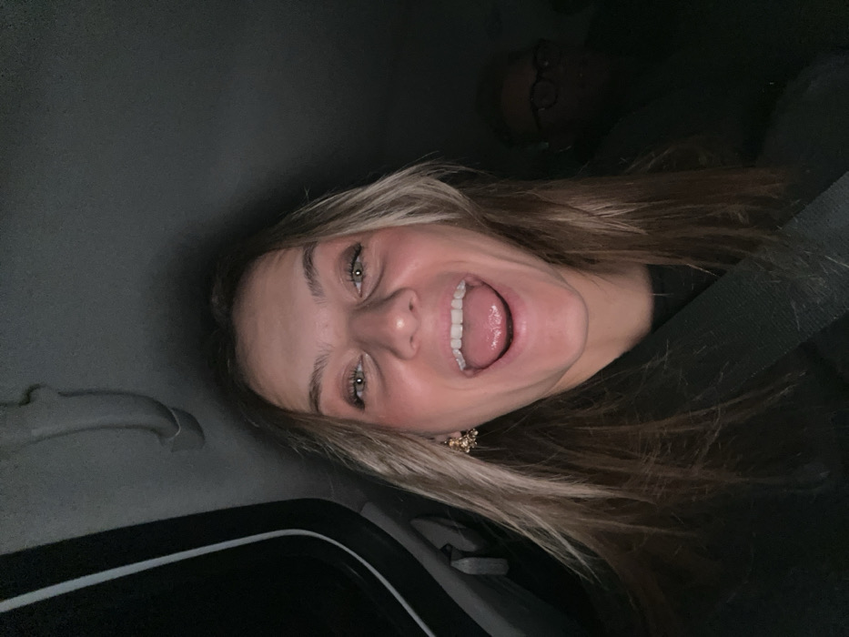 A young woman with blonde-highlighted hair poses for a selfie in a car. She's smiling widely with her mouth open. A seatbelt crosses her body. The car's interior is dark, with a partial view of the passenger-side door and handle. In the back, a blurry figure wearing glasses is visible in the shadows.