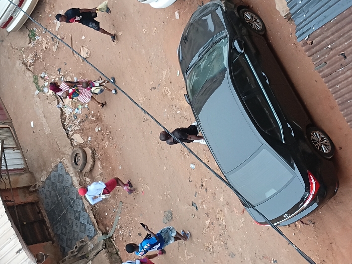 An overhead shot shows a street scene featuring a black car parked diagonally across a dirt road. Several people are dispersed around the car, including a man walking with a sack over his shoulder. Other people are standing, looking at their phones, or walking together. A tire is visible on the side of the road. The ground is uneven, with some areas littered with trash. The image appears to be taken from a high vantage point, likely a building.