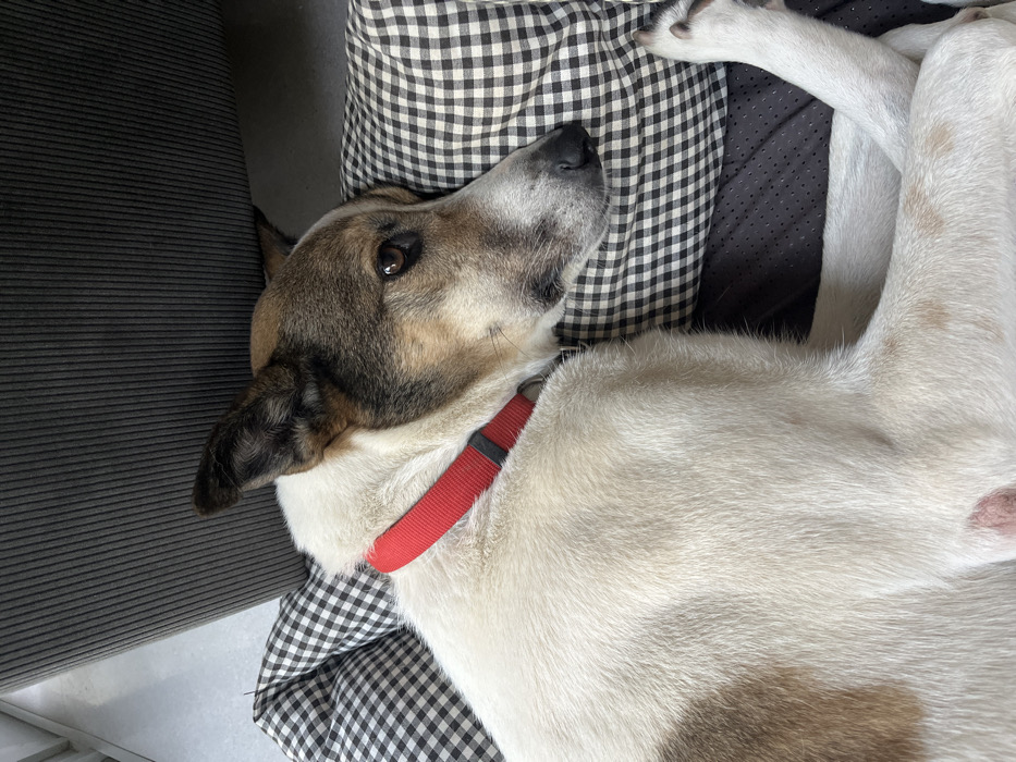 - "A medium-sized dog with white, brown, and black fur lies on a black and white checkered pillow in an indoor setting in Tel Aviv, Israel" by FM-qiLh83, licensed under CC BY 4.0
