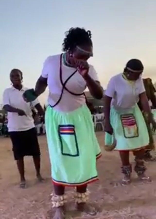three African women dancing in a grassy area. Two of them are wearing white shirts, light green skirts with colorful borders, and beaded anklets, as well as headbands. The third woman is wearing a white polo shirt and a black skirt. All three are facing the camera, and there are people seated in the background. The dancer in the foreground on the left is holding a phone and appears to be recording the dance.