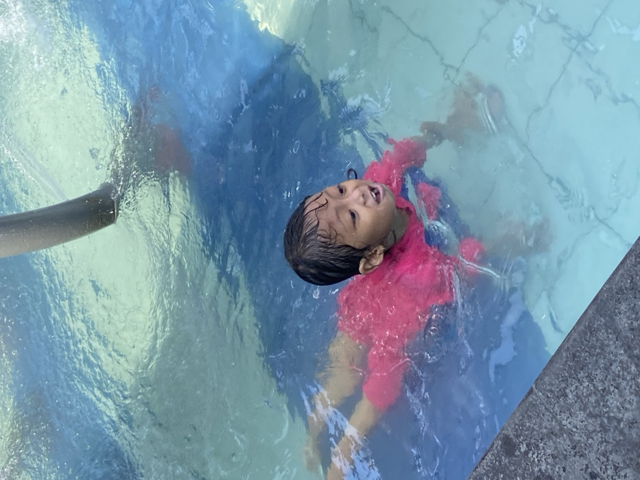 - "A young child floats on their back in a swimming pool, wearing a bright pink, long-sleeved rash guard" by FM-htxI33, licensed under CC BY 4.0