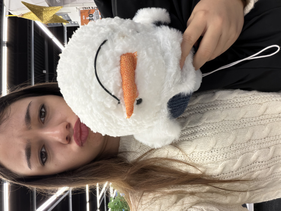 A woman poses sideways, holding a plush snowman toy. The snowman has a white, fluffy head with a stitched smile and an orange carrot nose. The woman wears a white cable-knit sweater. In the background are store fixtures and ceiling lights. The woman has light skin, brown hair, and pink lipstick. Her expression is neutral. The scene appears to be in a retail environment.