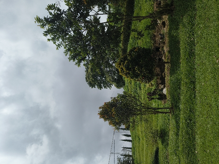 A vibrant landscape with lush green grass slopes upward, meeting a line of verdant trees and bushes. The sky above is filled with overcast clouds, creating soft, diffused lighting. Taller trees frame the scene at the top, while power lines are visible in the distance on the lower left. The image captures a serene, natural setting.