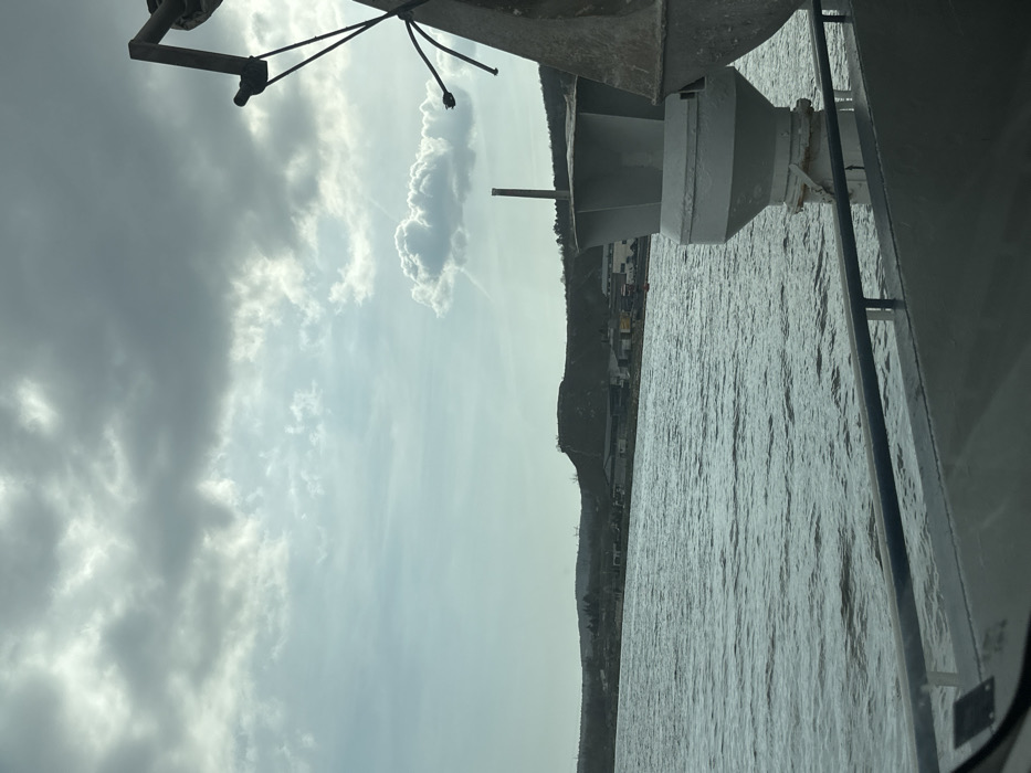 The scene depicts a view from a vessel traversing a body of water near Beloslav, Bulgaria, under an overcast sky with patches of lighter cloud cover. The foreground shows the grey deck of the vessel, with a dark blue handrail extending horizontally across the lower frame. On the right side of the vessel, a prominent white, cylindrical structure with a flared top, likely a ventilation or exhaust stack, is visible, partially obscured by an angular, dark metallic structure with attached cables or wires, possibly part of a mast or crane. The mid-ground is dominated by rippled, dark blue-green water. Across the water, the distant shoreline of Beloslav is visible. The landscape features rolling hills and elevated terrain, sparsely covered with vegetation. Along the water's edge, industrial or commercial buildings, appearing as warehouses or factory structures, are present. Piles of materials, consistent with industrial aggregates, are visible near these structures. A small, red buoy-like object is floating on the water near the shore. A distinct, higher hill or cliff face, also with sparse vegetation, dominates the right side of the distant shoreline. The sky above is largely cloudy, with a prominent, bright white cumulus cloud situated in the mid-right portion of the frame. No individuals or specific actions are discernible.