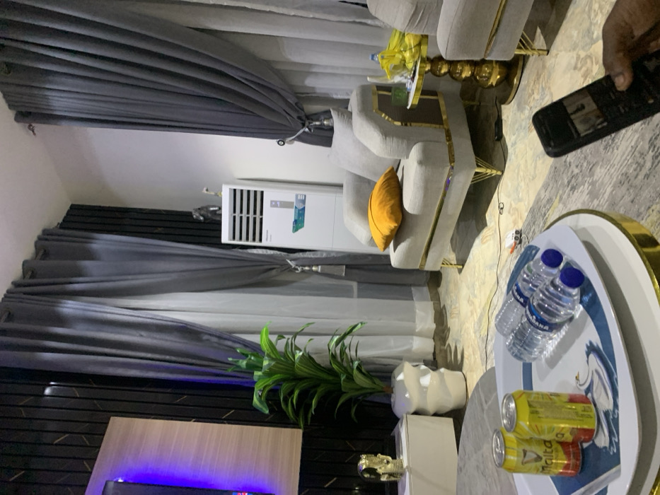 A living room is shown with gray drapes lining the top and side walls. A floor-standing air conditioner is visible. Furniture includes a gray sofa with a yellow pillow, a gold-legged side table with items on top, and a round coffee table with bottled water and cans. A potted plant sits beside a white ceramic container. The image is taken from a high angle.