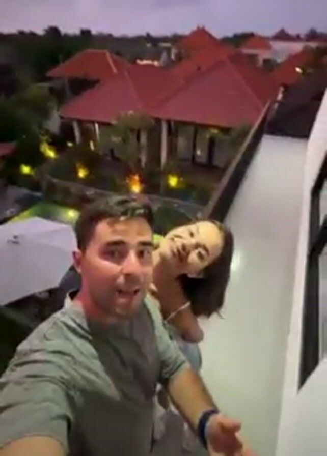 man and a woman on a balcony. They are filming a video, and the man says, “Welcome to our new house!” They are standing together, smiling, and excited. The man gestures to the scene behind them. The balcony overlooks several houses with red-tiled roofs, a lawn, and umbrellas. In the background, the sky is a mix of pink, orange, and gray clouds, suggesting it is either sunset or sunrise. The man then points to the sky. The camera pans across the view.