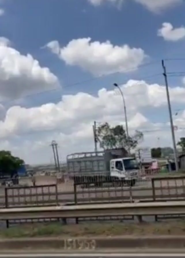 view from a moving vehicle, presumably a car, on a highway. The camera is pointed towards a parallel overpass with sparse traffic. The sky is partly cloudy with a bright blue sky peeking through. There are utility poles and light posts along the road. A few vehicles, including cars, trucks, and a van are visible on the overpass. Some vegetation is also visible on the other side of the road. The highway barrier is visible in the lower part of the frame.