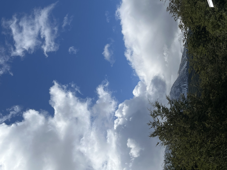 A bright blue sky is partially covered with fluffy white clouds. Some clouds are dense and gray. On the right side, dark green trees frame the image. Behind the trees, a mountain with patches of snow is visible. The photo is oriented sideways.