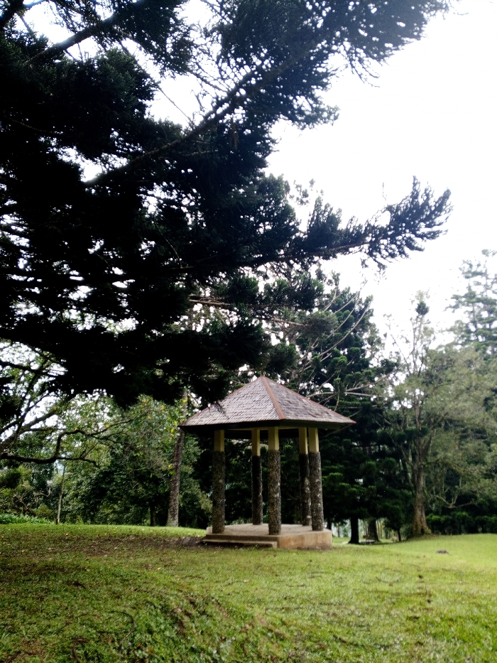 A gazebo with a tiled roof and six stone pillars stands on a grassy lawn. Tall evergreen trees frame the structure, casting shadows. The sky is overcast. In the background, various trees and shrubs contribute to the scene's lush greenery. The foreground features an uneven, grassy surface with subtle variations in elevation.