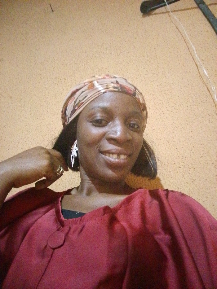 An adult Black female is depicted in a close-up, indoor shot against a textured, light brown wall. She wears a light brown patterned headscarf and a reddish-maroon top over a black garment, featuring a round button-like embellishment near the neckline. A prominent silver-toned earring is visible on her left ear, and a gold-toned ring is on her left ring finger, with her left hand positioned near her left ear. She smiles, revealing a diastema between her upper central incisors. In the upper right portion of the background, a dark, angled object resembling a coat hanger is visible, from which a thin white cord hangs. A small vertical mark is present on the upper-center wall. The specific city of Narayi, Nigeria, is not visually identifiable from the provided image.