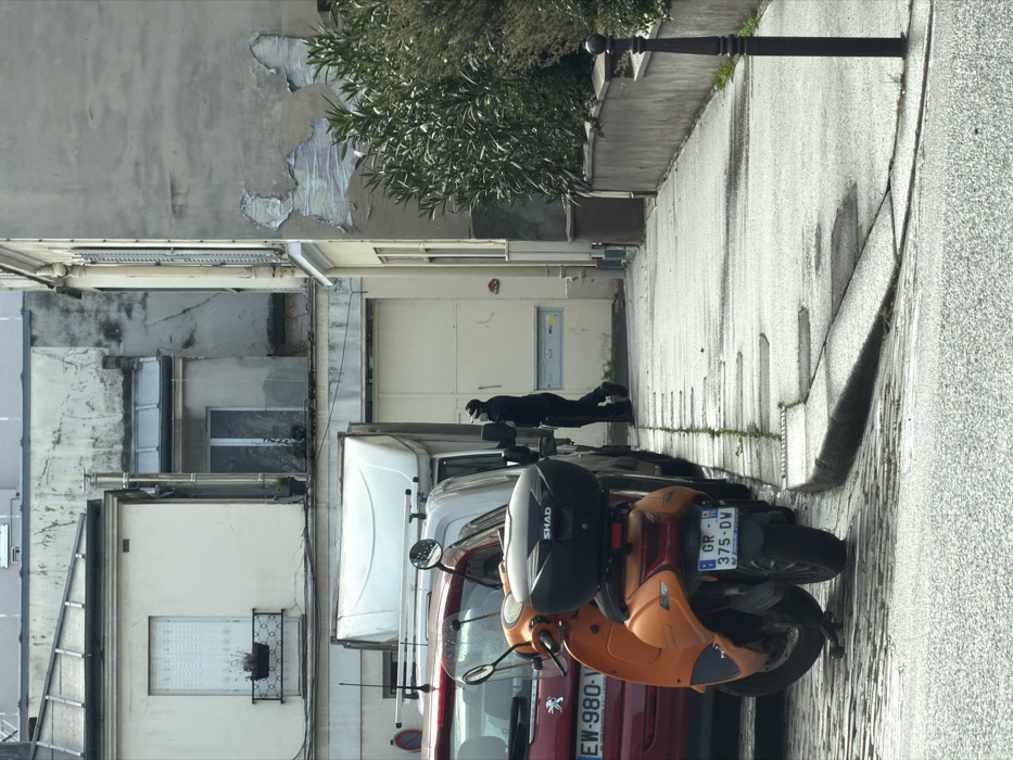 This image depicts a narrow urban street in Paris, France. In the foreground on the left, an orange scooter with a black "SHAD" brand top case is parked, displaying the French license plate "GR-375-DW". Immediately in front of it is a red Peugeot car, partially visible, with French license plate "EW-980-V". The street surface transitions from cobblestones near the parked vehicles to wet asphalt. In the midground, a person wearing dark clothing, including a black face covering, walks rightward along a narrow passage between a parked white van and a building. The building features a large, closed, light-colored garage door. To the right, a paved sidewalk runs parallel to a low concrete wall behind which dense green shrubbery grows. A black metal bollard with a spherical top is positioned on the right edge of this sidewalk. The background consists of multi-story buildings. The building on the far left has a cream-colored facade, a window with a closed white shutter, and a small wrought-iron balcony holding a planter. Other building facades are visible, some showing signs of weathering and peeling paint. The sky is overcast.