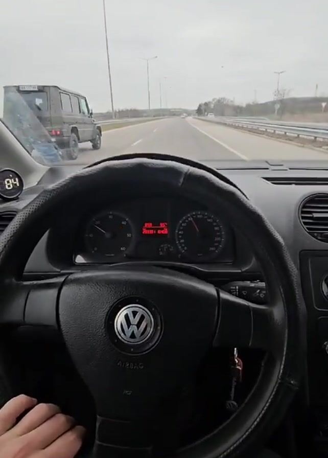 view from the driver's seat of a Volkswagen Caddy driving on a highway. The driver's left hand is visible on the steering wheel. The dashboard shows the car's speed and other information. Street lights line the side of the highway. Other vehicles are visible in the distance, including a black UAZ-469. The weather appears overcast.