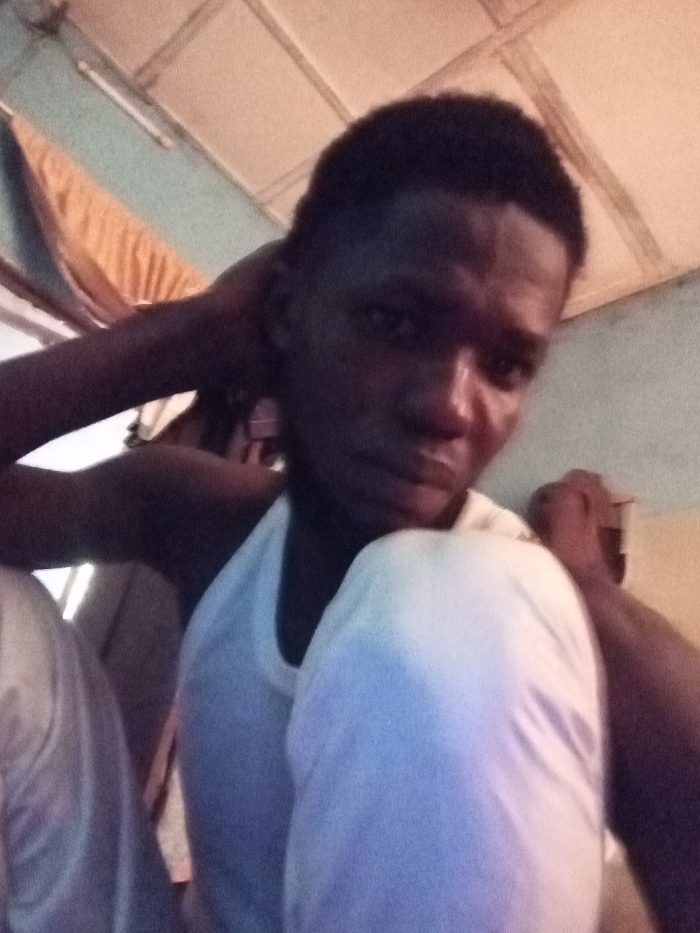 The image displays a dark-skinned male individual, approximately in his late teens or twenties, positioned indoors in the city of Toto, Nigeria
