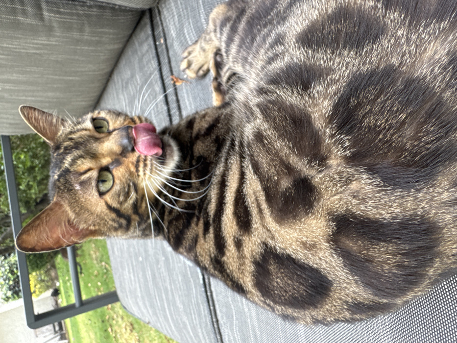 A Bengal cat lies on a gray cushioned surface, possibly an outdoor sofa. The cat's coat features dark brown spots and stripes on a lighter brown background. Its head is tilted upwards, tongue extended in a lick. The cat's green eyes are visible, as are its white whiskers. In the background, greenery and parts of a metal frame suggest an outdoor setting.