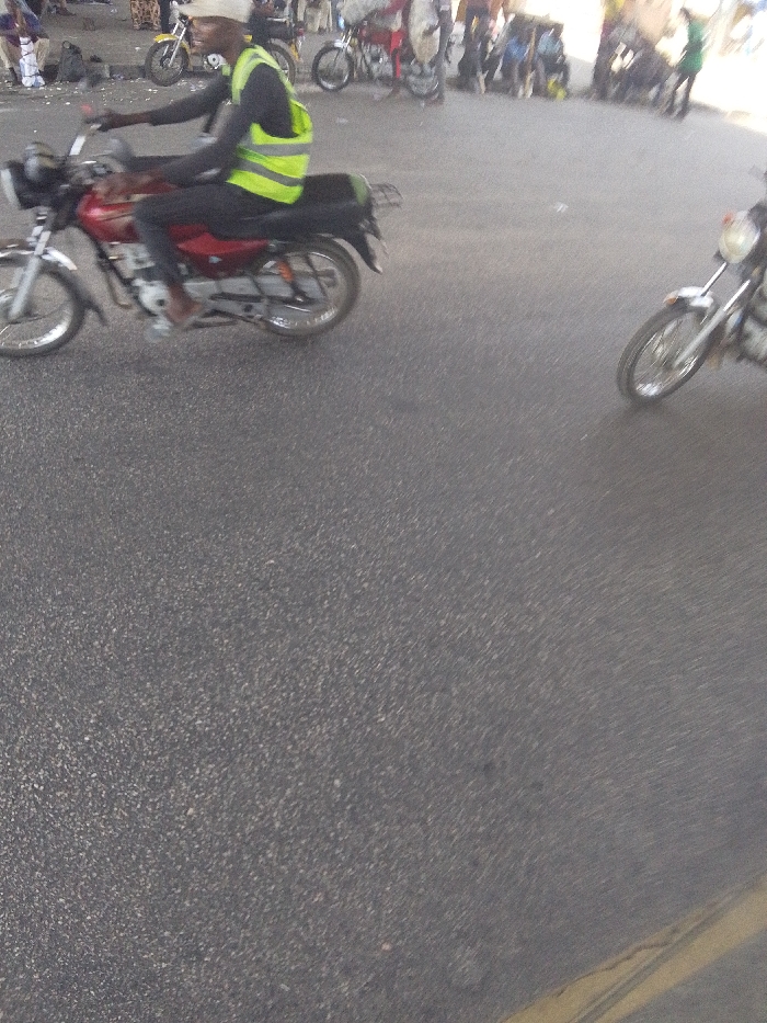 A man in a white hat and yellow safety vest rides a red motorcycle on a paved road. Another motorcycle approaches from the right. Other motorcycles and people are blurred in the background, suggesting a street scene. The foreground is primarily the asphalt road, which has a yellow line marking on the right.