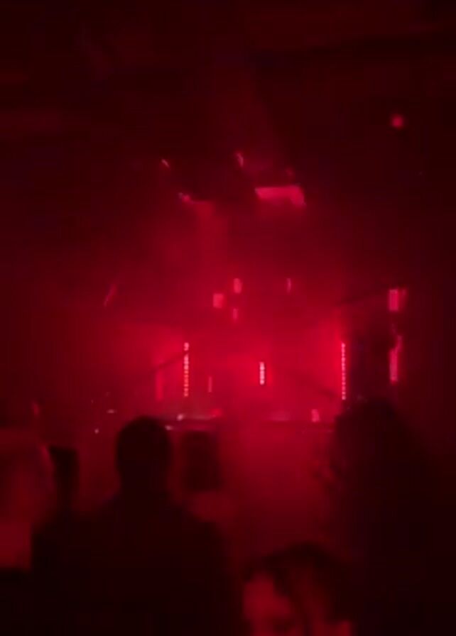 The video captures a music venue bathed in intense red light