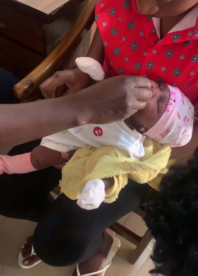 A woman in a red patterned shirt sits in a wooden chair holding a baby. The baby, wearing a pink patterned headscarf, a white shirt, and a yellow blanket, is lying in her lap. A person is using their fingers to open the baby's eye. The person's hands and arms are visible, and they are wearing a dark shirt. The woman is looking down at the baby. There is a wooden desk in the background with a book on top. The floor is tiled. Another person with curly hair is visible at the bottom right corner of the frame. The woman is wearing white flip-flops.