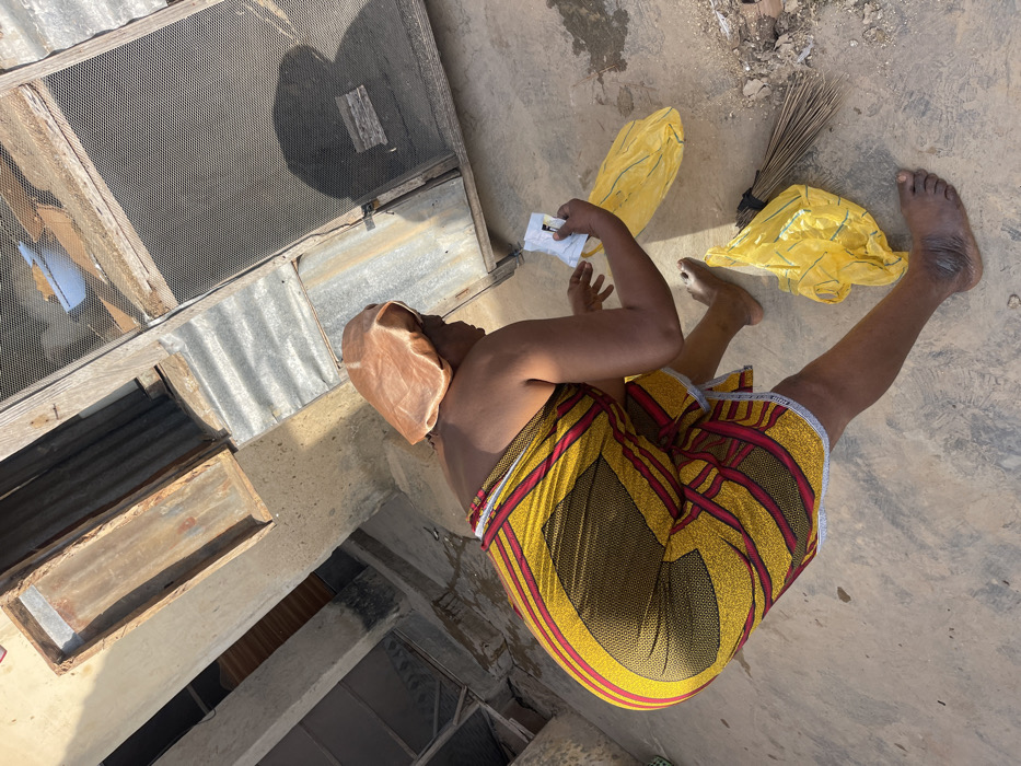 A woman kneels on a concrete surface outdoors, wearing a yellow and red patterned skirt and a brown head covering. She holds a small white object in her hands. Beside her are two yellow bags and a broom. A metal framed window with a screen is visible to the left, along with a metal framed structure beneath it. The concrete ground appears weathered.