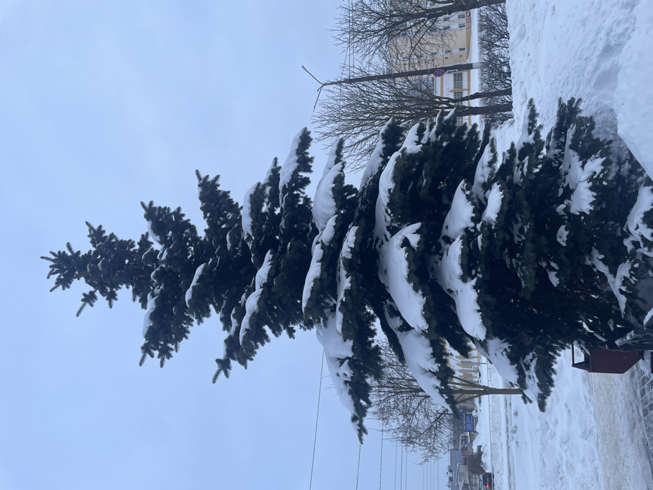 The image captures a winter urban scene in Vitsebsk, Belarus, specifically on Vulica Lienina (Lenin Street), near the intersection with Vulica Kamsamolskaja, oriented roughly west-southwest. The foreground is dominated by a large, coniferous spruce tree, approximately 10-12 meters in height, with dark green needles. Its branches are heavily laden with distinct layers of white, undisturbed snow. To the left of the spruce's base, a dark, rectangular metal trash receptacle is partially visible on a snow-dusted paved surface. In the midground to the left, a multi-lane asphalt road is visible, partially obscured by snow banks and a smaller, bare deciduous tree. A dark-colored vehicle is partially discernible on the road in the distance. Multiple thin power lines traverse the upper left quadrant of the frame. The midground to the right features a tall, slender brown utility pole with a street light fixture at its apex. Several other bare deciduous trees stand behind it. The background on the right displays a multi-story building with a light yellow/cream-colored facade on its upper floors and a darker brown/red section at its visible base. The building features multiple evenly spaced rectangular windows. A red circular traffic sign, indicating "No Entry" (a white horizontal bar on a red field), is positioned in front of this building at an approximate eye level for a standing person. The sky is uniformly overcast and light grey, suggesting a winter day with diffused light and no direct sunlight. All visible ground surfaces, including sidewalks, road edges, and open areas, are covered in a consistent, significant layer of white snow, indicative of recent snowfall and cold ambient temperatures. No individuals or active interactions are present in the scene.