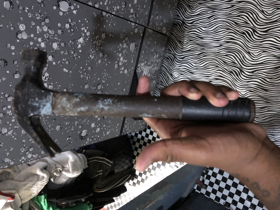 The image displays a dark-skinned hand gripping a worn claw hammer, in an indoor setting described as being in Nyeri, Kenya. The hammer's metal head and shaft are heavily rusted and exhibit patches of light blue-green discoloration. Its handle is black and has a ribbed texture. A tattoo composed of interconnected circular or abstract shapes is visible on the inner forearm of the hand. The immediate environment to the left of the hammer features a pile of assorted clothing, including white towels and green fabric, resting on a black and white checkered tile floor. To the right and in the background, a dark gray surface, consistent with a cabinet door or wall panel, is adorned with a pattern of numerous reflective, variably sized, circular or droplet-like forms. A black and white fabric featuring a wavy, organic stripe pattern is visible on the surface beneath the hammer on the right side of the frame.