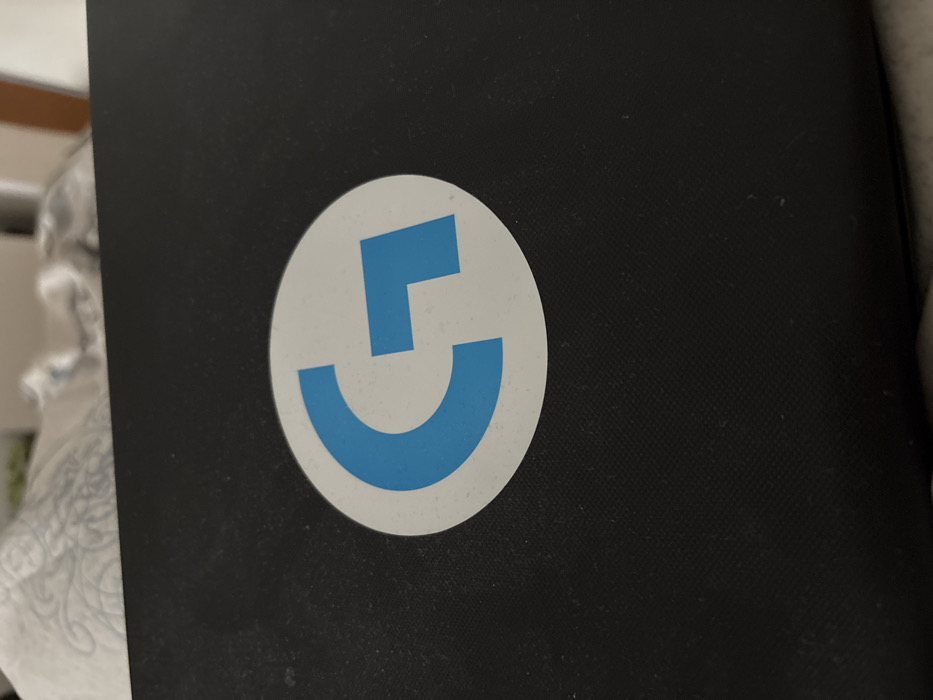 The image displays a close-up, top-down view of a black, textured surface, identified as the lid of a closed electronic device, likely a laptop. Adhered to the center-right of this surface is a circular white sticker featuring a bright blue logo. The logo is the recognizable "Logitech G" emblem, composed of a stylized 'G' formed by a crescent shape and an angular block. The black surface shows evidence of minor dust accumulation. In the upper background, out of focus, is a light-colored, patterned fabric, consistent with bedding or upholstery. A blurry, light brown vertical element is minimally visible in the far upper right background. No people are visible. The scene is static, depicting objects and their arrangement. The image contains no visual information that allows for the identification of a specific location within Sofia, Bulgaria.