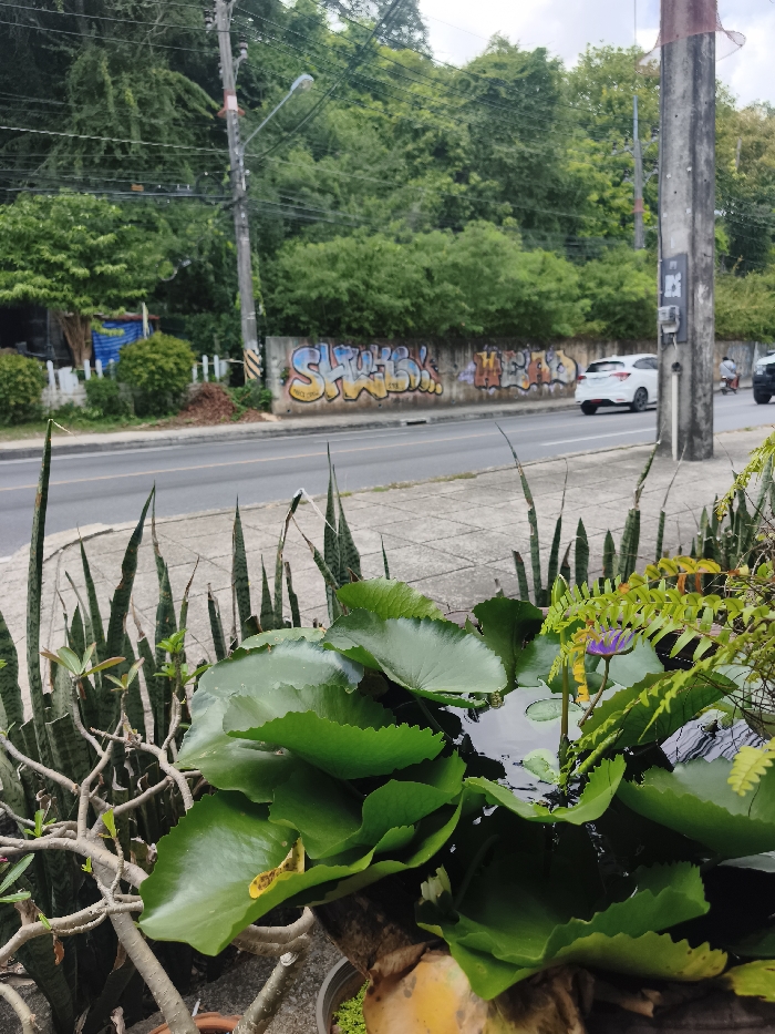 The image depicts a roadside scene in Baan Hua Thanon, Thailand, captured from a low vantage point on a sidewalk. In the immediate foreground, a container, possibly a cut tree trunk, holds water with numerous large, green lotus leaves floating on the surface. A single purple lotus flower is partially open on the right side of this container, accompanied by green fern foliage. To the left of the lotus container, several upright, blade-like Sansevieria (snake plant) leaves are visible, alongside gnarled, brown branches from another plant. The ground beneath these plants is a tiled grey sidewalk. Across the sidewalk, a two-lane asphalt road stretches horizontally, delineated by a solid white line. On the far side of the road, a concrete retaining wall, approximately 1 to 1.5 meters high, is covered with colorful graffiti featuring text like "SKWISH" and other illegible markings. Behind this wall, a dense line of green bushes and trees extends upwards. A white SUV, resembling a Honda HR-V, is observed driving away from the camera in the right lane, with a darker vehicle partially visible behind it. To the far left, behind a small pile of brown debris, a structure with a blue tarp roof and a white picket fence is partially obscured by foliage. Two utility poles, equipped with electrical wires and streetlights, stand along the roadside. The background consists of a lush, verdant hillside covered in dense trees under an overcast sky. No individuals are explicitly visible.