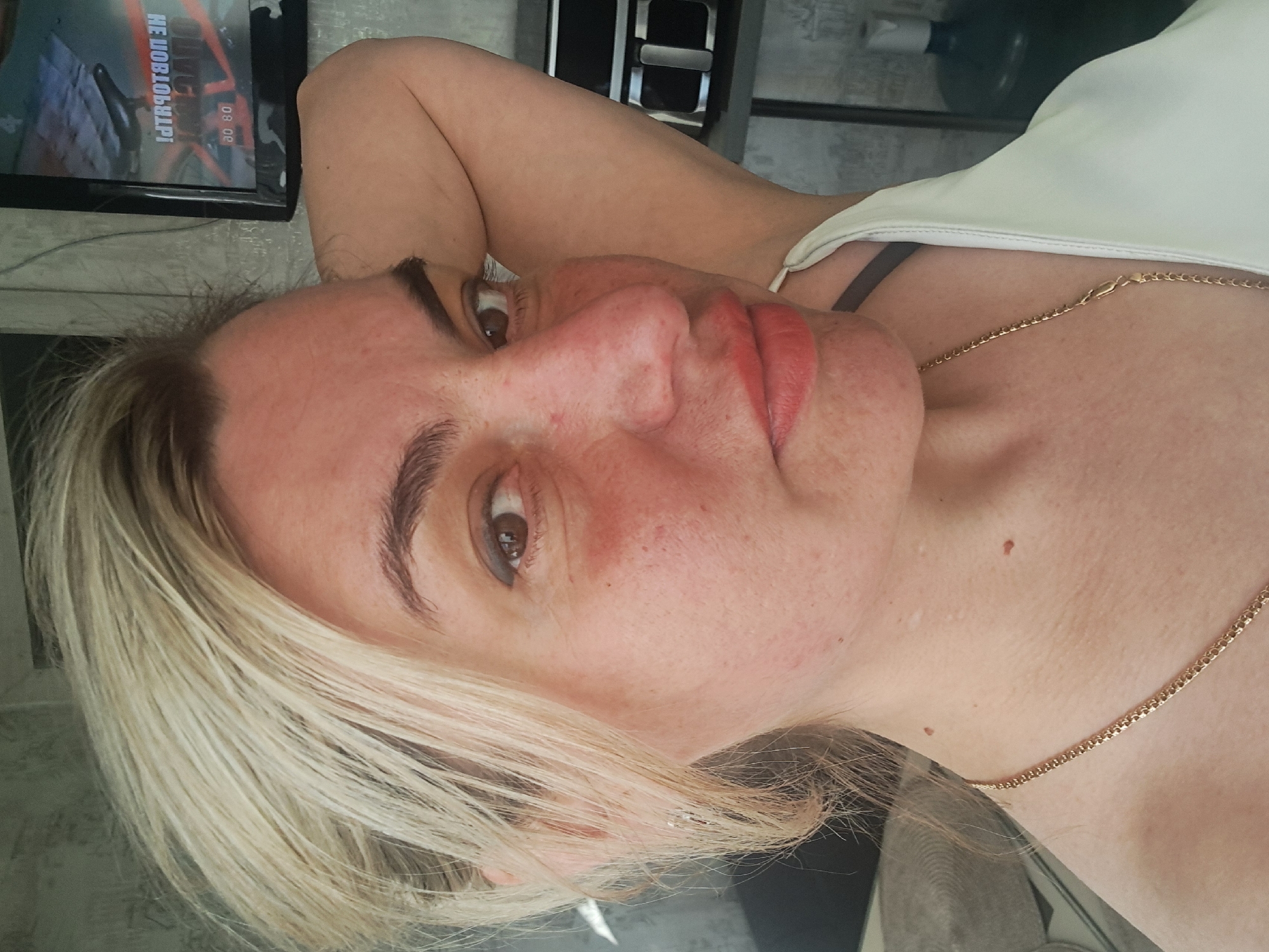 A close-up, slightly off-center shot depicts a fair-skinned woman with blonde, shoulder-length hair. Her face is flushed, particularly around the nose and cheek areas. She has brown eyes and reddish-pink lips. She is wearing a light-colored top with a thin strap visible, and a gold chain necklace is around her neck. A TV screen with text in Russian and a time stamp is visible in the upper left corner. Other objects, including a water cooler, are in the background. The location is Elektrostal, Russia.