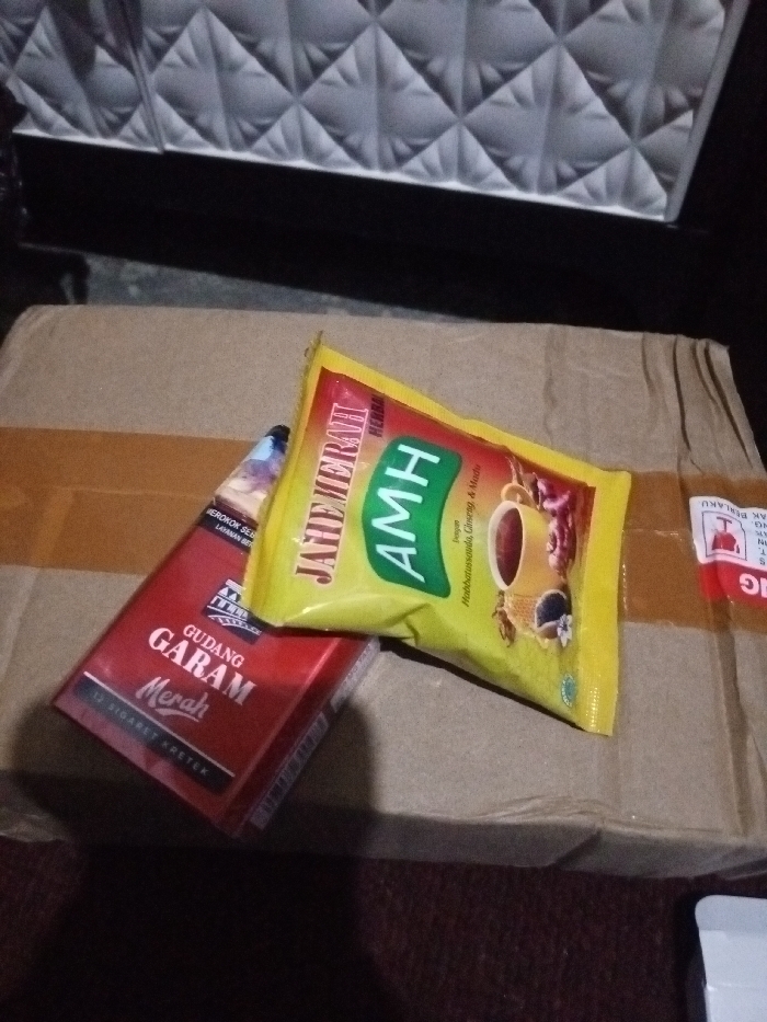 A red pack of Gudang Garam Merah cigarettes and a yellow packet of Jahe Merah AMH herbal drink mix rest on a brown cardboard box