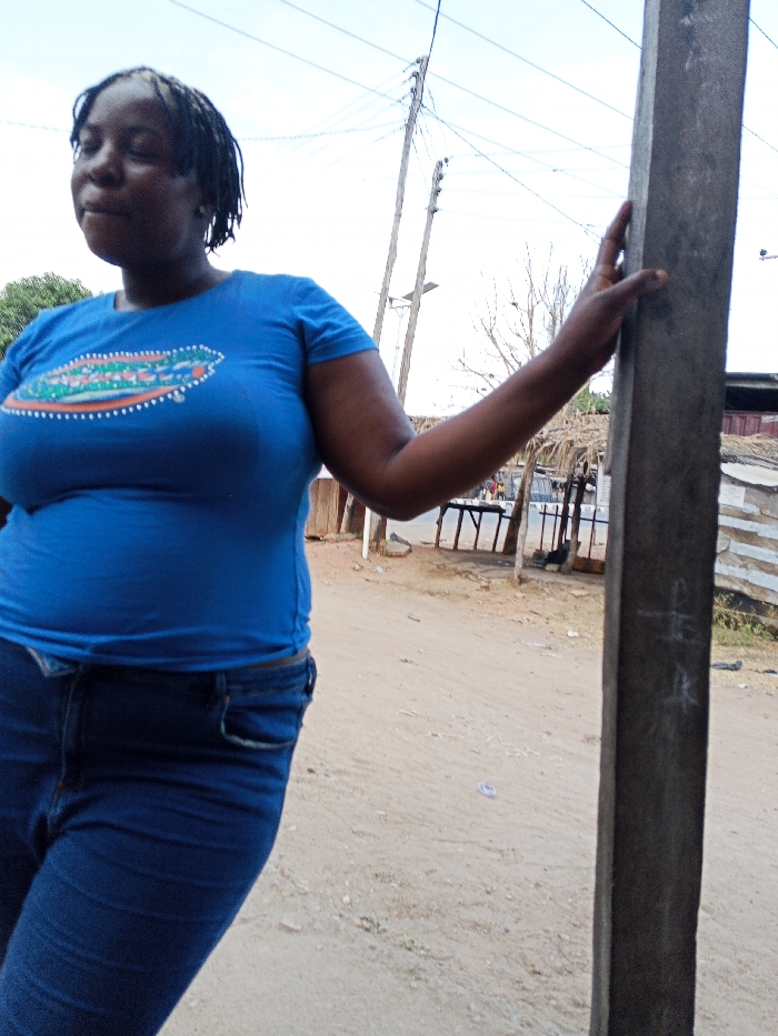 A woman in a blue t-shirt and jeans leans against a post. She has dark hair pulled back, and her left hand rests on the post. The background shows a dirt road and simple structures with corrugated metal and thatched roofs. Power lines stretch across the sky. The lighting suggests it's daytime. A dog appears to sit underneath a table in the background.