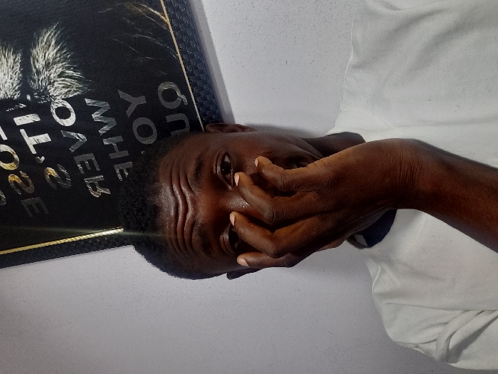 A dark-skinned individual with a hand covering part of their face is shown. The person has a furrowed brow and visible wrinkles. Adjacent to the person is a black and gold wall hanging displaying a lion image and text. The individual is wearing a white garment. The background includes plain walls.