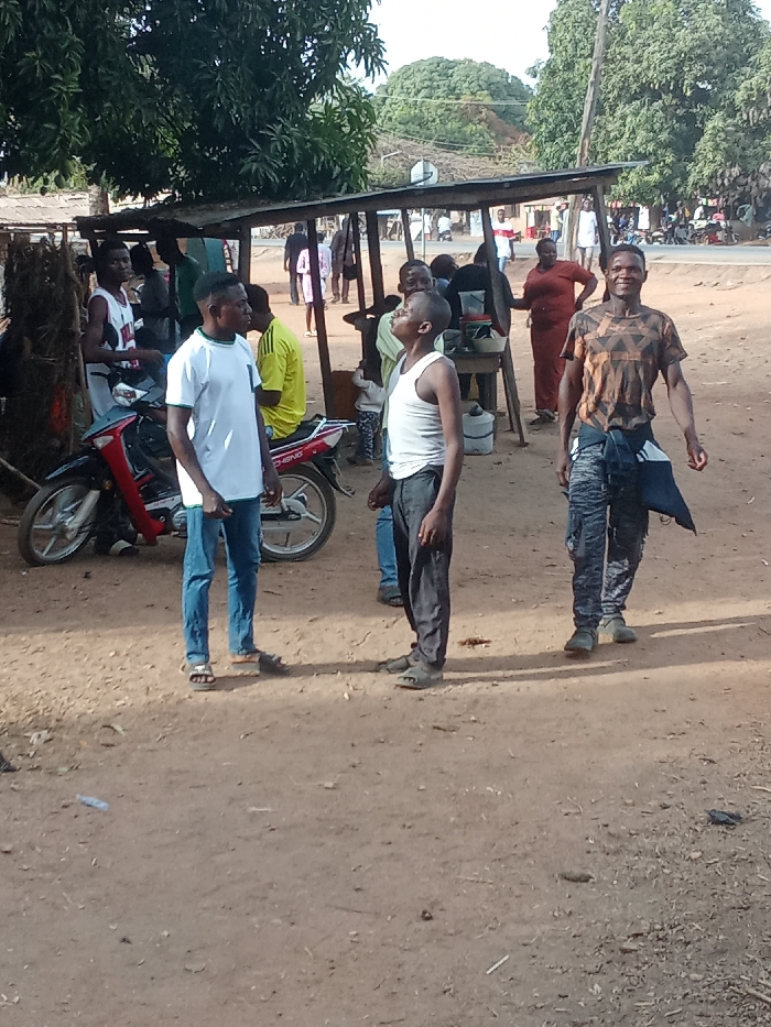 scene in Gundzhe, Nigeria, taken in the street outside a market. The street is a dirt road, with several people standing or walking around. There is a small motorcycle parked in the center of the image, and to the left of the motorcycle is a man in a white shirt and blue jeans. He is talking to a younger man in a white tank top and dark pants. A man in a brown shirt and camouflage pants is walking away from the camera on the right, and several more people are visible in the background. There is a tree on the left side of the image, which is providing shade for the people standing near it. There is a stall on the other side of the motorcycle and to the right side of the image. The image was taken on a clear sunny day, and the ground is dusty.