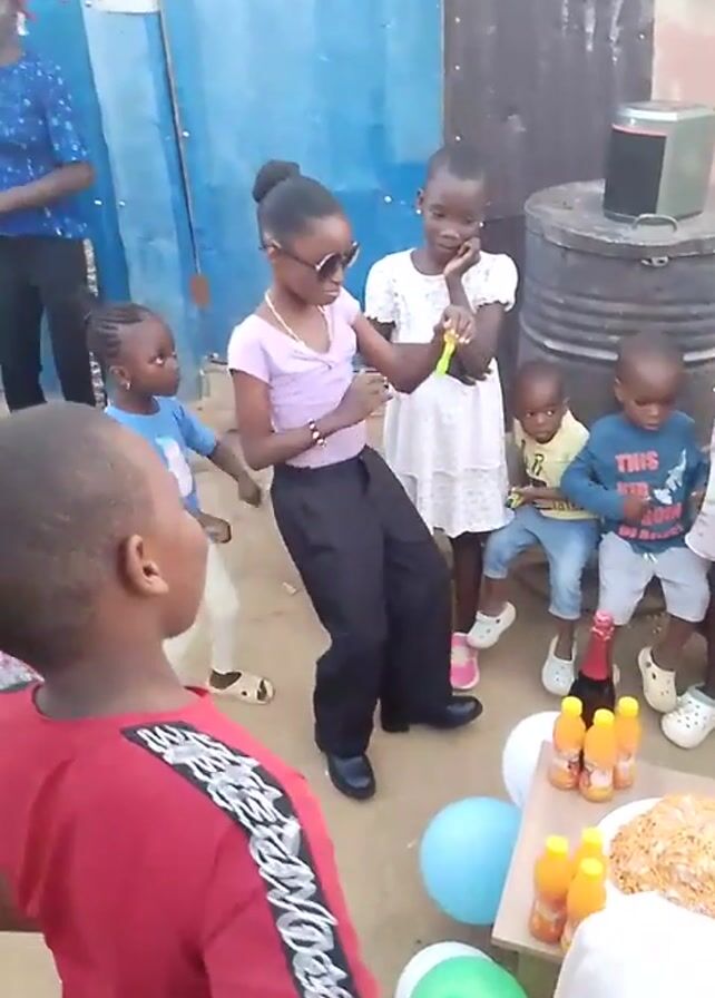 group of children, one of whom is dancing, at what appears to be an outdoor party. The dancing girl wears sunglasses, a light purple top, and black pants and shoes. She stands in the center, with other children gathered around watching. Some are sitting on a low platform. In the background, a woman wearing a blue patterned top and black pants stands. To the side, there is a table with bottles of juice, a white cake, and balloons. Behind the group are a blue metal wall and a black barrel with a small speaker on top. The scene has a celebratory atmosphere.