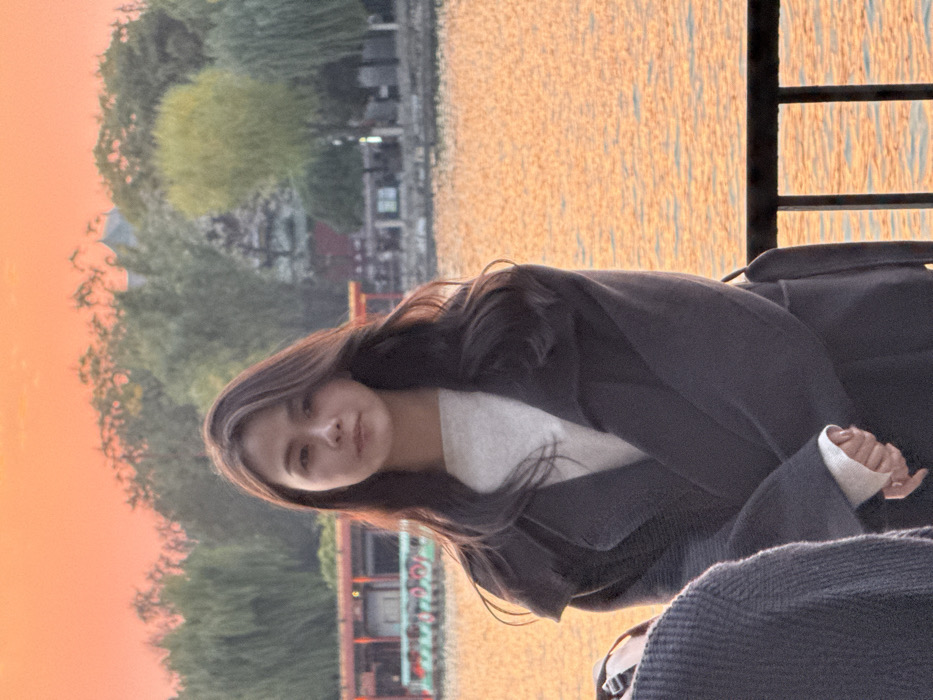 The image depicts an outdoor scene at Beihai Park in Xicheng District, Beijing, China, during either sunset or sunrise. The sky and the surface of a large lake are illuminated with an intense orange-red hue. In the foreground, a young adult East Asian female is centrally positioned, looking directly at the camera with a neutral expression. She has long, dark hair and is wearing a light-colored top under a dark gray, long-sleeved coat. Her hands are clasped at her waist. A partial view of a second individual, facing away from the camera and wearing a dark knitted garment, is visible in the lower-left corner. A dark metal railing runs horizontally in the lower-right foreground. The background features the lake, which exhibits ripples reflecting the sky's color. The far bank is lined with numerous trees, including weeping willows. Visible through the trees are several traditional Chinese-style buildings with dark tiled roofs and red accents; one structure on the left appears to be a boathouse. A long, narrow boat with red trim and a white canopy is visible on the far side of the lake.