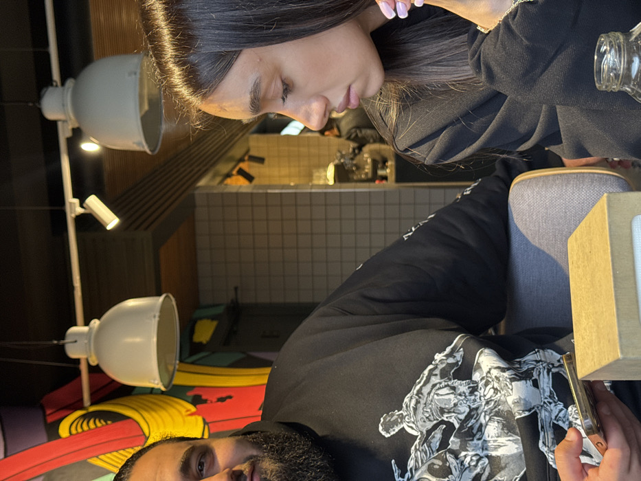 The image depicts an indoor establishment, likely a cafe or restaurant, in Yerevan, Armenia. In the foreground, two individuals are seated at a table. On the left, a male subject is partially visible, from the nose down. He has a full dark beard and is wearing a black long-sleeved sweatshirt featuring a large white graphic print of classical figures on horseback. He holds a gold-colored smartphone in his left hand. His right arm rests on a light gray upholstered chair. To the right, a female subject is shown in profile, looking downwards and slightly forward. She has long, straight dark brown hair and is wearing a black long-sleeved top. Her left hand, with light pink fingernail polish, is near her chin. Her arm rests on a light gray upholstered chair. On the table in front of them, a small, rectangular kraft paper napkin dispenser is visible. A clear glass bottle, possibly containing a beverage, is also present near the female subject. The background reveals a modern casual environment. The ceiling is dark with visible structural elements and recessed wooden slats. Two large, white, bell-shaped industrial pendant lights hang from the ceiling, along with white track lighting fixtures. A vibrant, abstract mural in colors of red, yellow, blue, and green is on the wall to the left. In the mid-background, a wall covered in light-colored square or rectangular tiles is visible. Further in the background, a blurry figure wearing a dark jacket stands behind what appears to be a counter.
