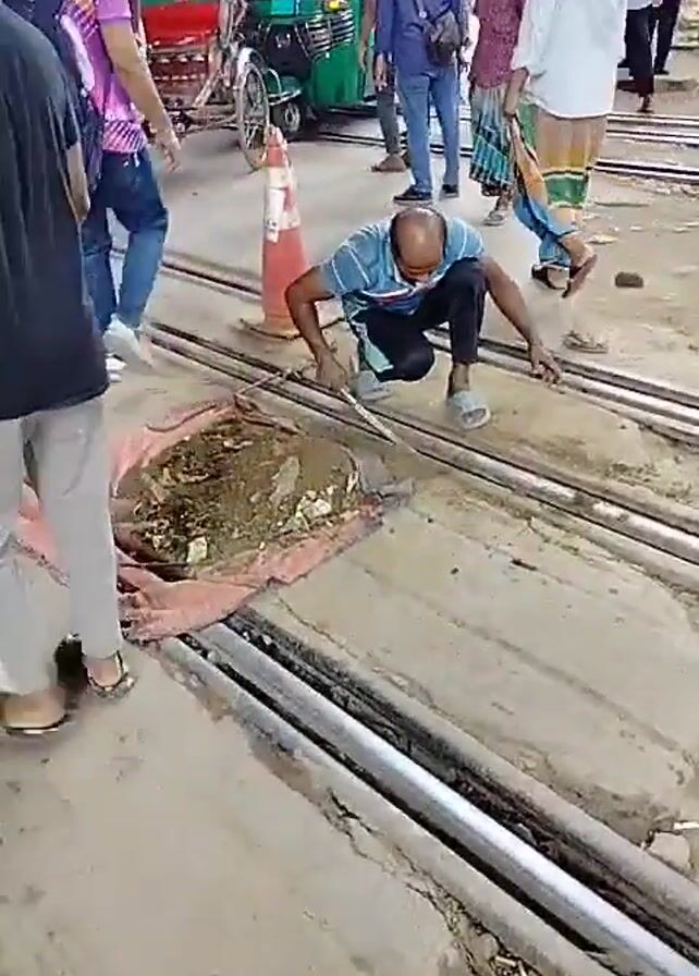 man in a striped shirt and dark pants squatting next to a set of parallel metal rails, possibly train tracks. He is scraping at a pile of debris on a cloth with a tool. An orange traffic cone is next to the cloth. Several people walk by in the background. There is a green auto rickshaw parked nearby. The ground is concrete.