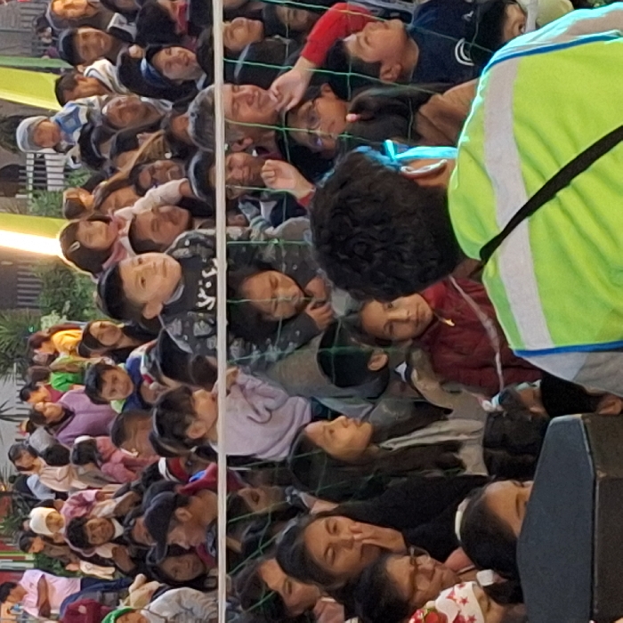 A crowd of diverse individuals, mostly children, are gathered behind a barrier, likely a fence or net. Their faces are turned upwards, suggesting they are watching something above them. An adult wearing a bright green reflective vest is partially visible on the right, seemingly monitoring the crowd. The scene appears to be an outdoor event or gathering.
