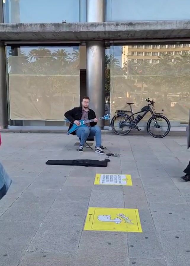 A man is playing a blue electric guitar outdoors. He's seated on a stool in front of a building with a large window. A bicycle is parked behind him. A guitar case and two yellow signs are on the ground in front of him. A woman walks past him on the sidewalk. The location appears to be an urban area. The man has glasses, a beard, and is wearing jeans and a black jacket. He's focused on playing the guitar.