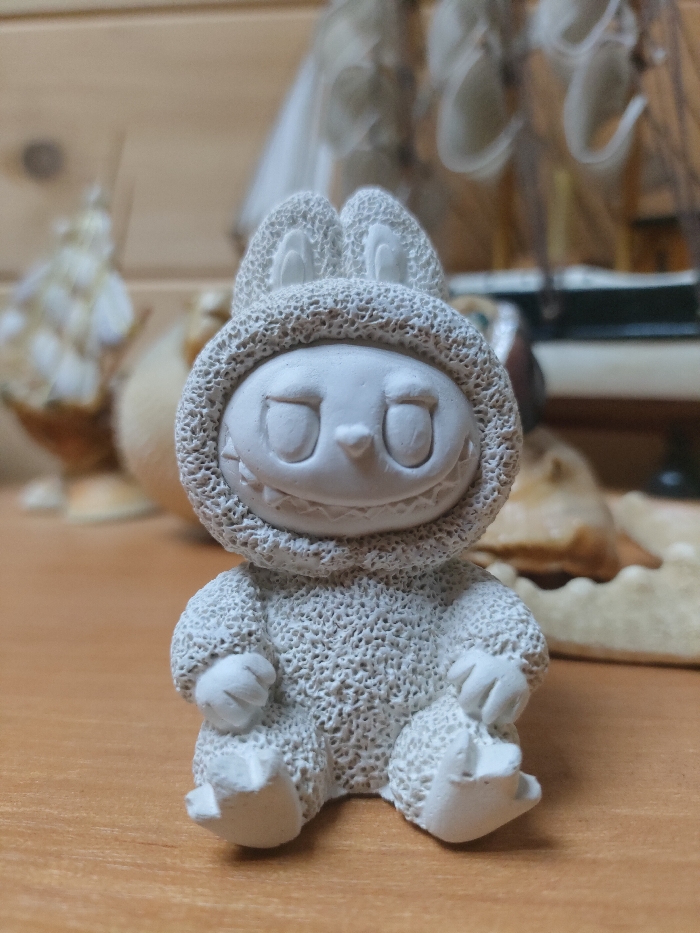 A white, textured figurine of a creature resembling a child in an animal costume sits on a wooden surface. It has a hooded outfit with bunny ears. The face features closed eyes, a small nose, and a wide, toothy grin. Its small hands rest on its lap, and it appears to be sitting with its legs slightly spread. The background is blurred, showing other objects including a model ship, giving depth to the image.