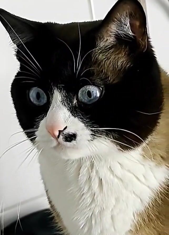 close-up of a cat's face. The cat has striking blue eyes and a unique color pattern: black fur on its head, a white patch on its face including a pink nose, and white fur on its chest. The background appears to be a white wall. A voice says, "Yeti."