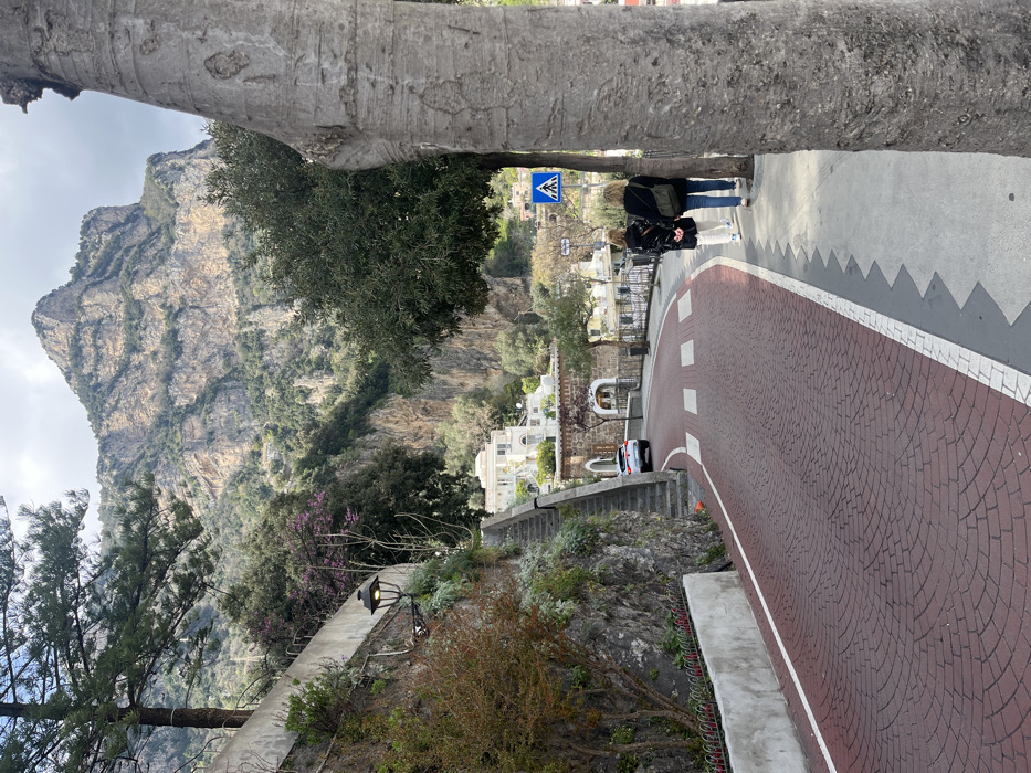 This image depicts a curving street in Arienzo, Italy, viewed from a slightly downhill perspective. A large, vertically oriented tree trunk with textured bark occupies the right foreground. To its immediate left, a light gray sidewalk features a distinct gray serrated border adjacent to the red-paved roadway. Two individuals, observed from behind, walk away from the viewer on this sidewalk. The person closer to the road wears a dark jacket and light trousers; the person closer to the tree wears a dark jacket, dark trousers, and carries a light-colored shoulder bag. A blue circular pedestrian crossing sign, featuring a white walking figure, is visible on a pole behind them. The road itself is paved with red, fan-patterned interlocking pavers, curving sharply to the left. White painted lines delineate the sidewalk and road, and a white pedestrian crossing is marked on the pavement. A white SUV is visible further up the road, positioned on the left side of the curve. On the left side of the road, a substantial stone retaining wall is partially covered with green foliage, including small shrubs and a tree with purple blossoms. An ornate black street lamp is affixed to this wall. A set of stone steps ascends steeply alongside the retaining wall, disappearing upwards. In the middle ground, several white multi-story buildings with light-colored tiled roofs are integrated into the steep hillside terrain. The background is dominated by a towering, rugged mountain face, characterized by exposed rock formations and extensive green vegetation. The sky above is partially overcast.