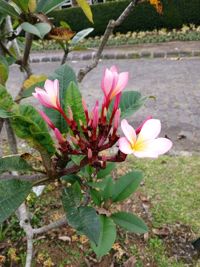 An outdoor scene in Batheay, Cambodia, captures a close-up view of a Plumeria (Frangipani) plant. The central focus is a cluster of developing and blooming flowers and buds, characterized by pink and white petals with yellow-orange centers. Several fully opened flowers, along with numerous tightly clustered, reddish-pink buds, are attached to a dark reddish-brown stem, surrounded by dark green, elliptical leaves. The plant emerges from a ground surface consisting of reddish-brown soil, sparse dry leaves, and small patches of green ground cover. In the background, a grey paved surface, possibly constructed from interlocking pavers, is visible, bordered by a concrete curb. Beyond the paved area, a strip of green grass extends. The distant background features blurred dark green hedges or shrubs, suggesting a landscaped environment adjacent to a pathway or road. No individuals or animals are present in the image.