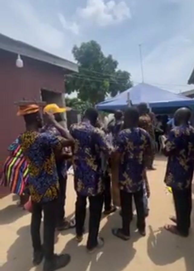 A group of men, dressed in matching blue shirts with a yellow floral pattern, are playing drums and dancing in a residential area. They are gathered in a semi-circle, with their backs to the camera, around a central drummer who is obscured from view. A few people, also in traditional African attire, stand around them watching. In the background, a blue and white tent is set up, suggesting an event or gathering. The houses and trees visible in the surroundings indicate a village setting. The weather appears sunny.