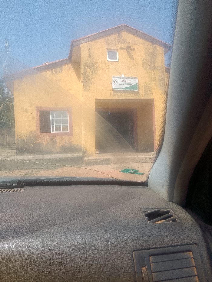 A yellow building with a simple architectural design stands in the distance. It features a small window on the left, a sign above a dark central entrance, and another small window near the roof. The image is taken from inside a vehicle, with a dark dashboard and parts of the car's interior visible in the foreground, creating a framed perspective of the building.
