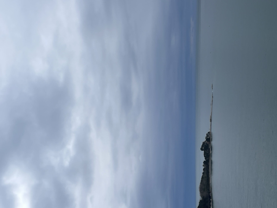 The image displays a coastal landscape under an overcast sky, depicting Sveti Stefan, a distinctive island-like peninsula in Budva, Montenegro. The upper two-thirds of the frame are dominated by a uniform, dense layer of grey stratocumulus clouds, transitioning from lighter grey at the top to a darker grey-blue above the horizon. The lower third of the image shows the calm, flat surface of the Adriatic Sea, which is a muted grey-blue, reflecting the sky. On the left, extending into the sea, is Sveti Stefan. This landmass is characterized by dense, dark green and brown vegetation, primarily trees and shrubs, covering its elevated sections. Numerous buildings, consistent with the historic village and resort, are clustered on the island, featuring muted terracotta roofs and light-colored facades. A narrow, light-colored causeway, composed of sand and rock, connects the main island cluster to the far left, extending a short distance into the water before tapering off. Two small, dark, vertical cylindrical objects, consistent with navigational buoys or markers, are visible in the middle-right distance of the sea. No people, vehicles, or active vessels are present. The scene is illuminated by flat, diffused light characteristic of an overcast day.