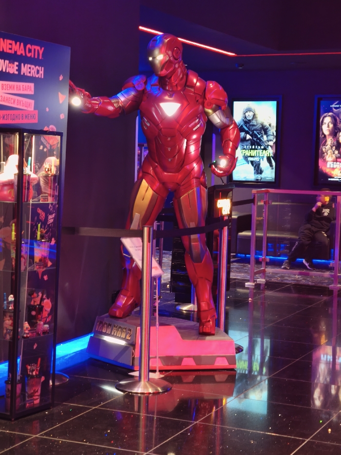 The scene depicts a brightly lit, modern cinema lobby at Cinema City in Varna, Bulgaria. A prominent, life-size statue of Iron Man, clad in red and gold armor with illuminated eyes, arc reactor, and repulsor emitters, stands on a dark, multi-level platform labeled "IRON MAN 2". The statue is positioned centrally, cordoned off by stanchions and a black rope barrier. To the left of the statue, a tall, narrow glass display case showcases various movie merchandise. Above this display, a black sign with pink accents reads "CINEMA CITY MOVIE MERCH" in English, followed by Bulgarian text: "ВЗЕМИ НА БАРА, ЗАНЕСИ ВЪКЩИ!" (Take at the bar, Take home!) and "ИЗГОДНО В МЕНЮ" (Affordable in the menu). In the background, two framed movie posters are mounted on a dark wall. The left poster features a male figure in winter attire holding a rifle, with Cyrillic text, likely for the film "The Keeper". The right poster displays multiple female figures. Below the posters, dark seating is partially visible behind a transparent barrier. A single individual, dressed in dark clothing (hoodie and track pants), is partially visible to the right of the Iron Man statue, in a crouching position behind the transparent barrier. The floor is dark, glossy, tiled, reflecting ambient light. The environment is illuminated by blue and red LED strip lights along the floor edges and ceiling, contributing to a vibrant, entertainment-focused atmosphere.