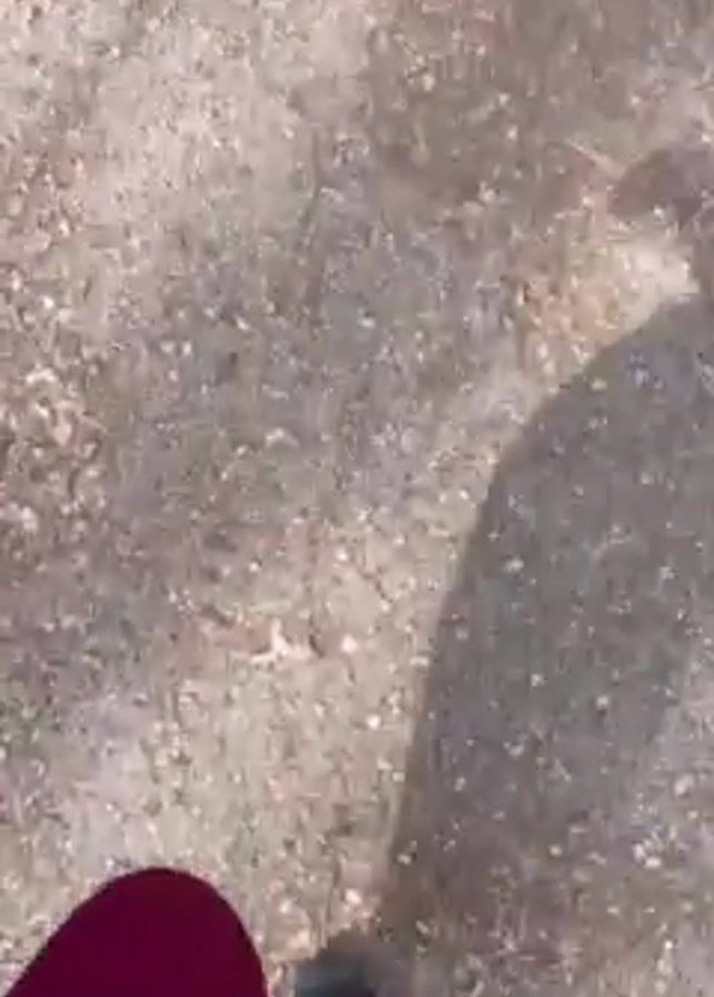 person walking on a dirt path in a wooded area. The person is wearing red pants and black sneakers, and their shadow is visible on the ground. The path is covered with dirt, small rocks, and leaves. Trees line both sides of the path. There appears to be a ropes course up in the trees, constructed with wooden platforms, ropes, and yellow safety tape. The sky is visible through the trees and is a light blue color.