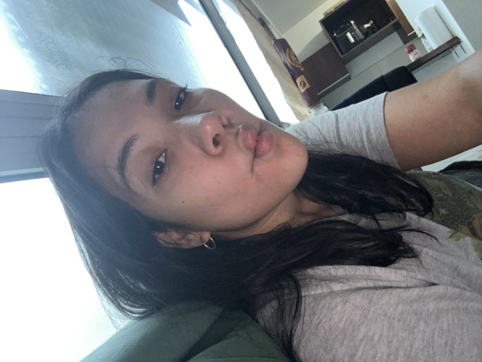A female individual with dark hair is depicted in a self-portrait image, positioned diagonally across the frame