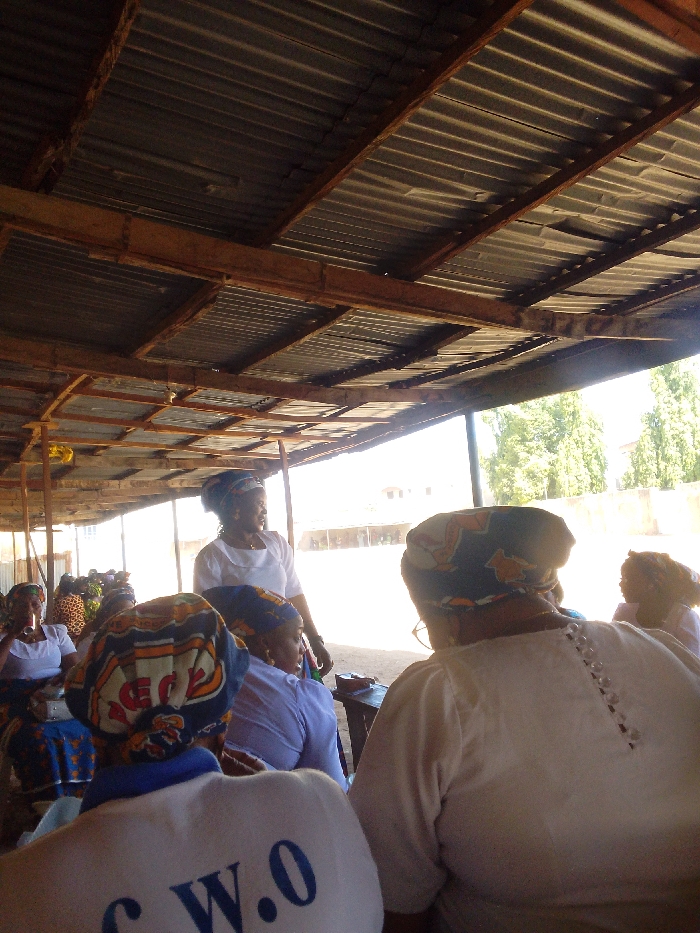 gathering of multiple adult women under a corrugated metal roof in Sabon Gari West, Nigeria