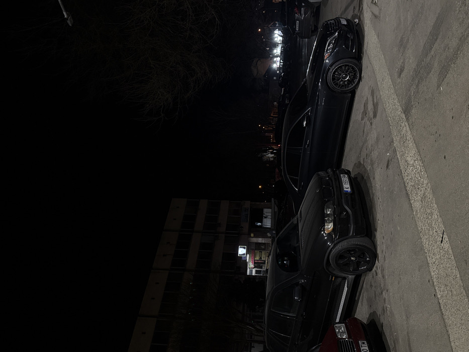 The scene depicts an urban environment at night in the city of Dobrich, Bulgaria. The vantage point is from a paved parking area, looking towards a multi-story building in the background. In the immediate foreground, from left to right, are three parked vehicles. On the far left, a dark red/maroon sedan is partially visible, displaying a partial Bulgarian license plate reading "4260 TM". Adjacent to it, centrally positioned, is a black BMW X5 (E53 generation) SUV, displaying Bulgarian license plate "K 1551 BM". This vehicle is equipped with black multi-spoke wheels and a running board. To its right, a dark grey/black Mercedes-Benz S-Class (W222 generation) sedan is parked, also featuring black multi-spoke wheels, with a partial license plate "7189" visible. All three prominent vehicles are parked in parallel, facing towards the right side of the frame. The background features a multi-story building, appearing to have at least three visible floors with multiple windows, predominantly dark against the night sky. On the ground level of this building, at least two commercial establishments are visible, illuminated from within. One appears to be a brightly lit kiosk-like structure or small shop. Additional vehicles are parked in rows further in the background, dimly lit, with one displaying a partial license plate "7E07 BM". To the right of the frame, bare, branched tree limbs are silhouetted against the dark sky, indicating deciduous trees without foliage. Artificial light sources, including streetlights (one fixture partially visible in the upper right) and building illumination, provide the primary lighting for the scene. The paved ground exhibits white painted lines and scattered wet patches. No individuals, specific actions, or interactions are discernible within the frame.