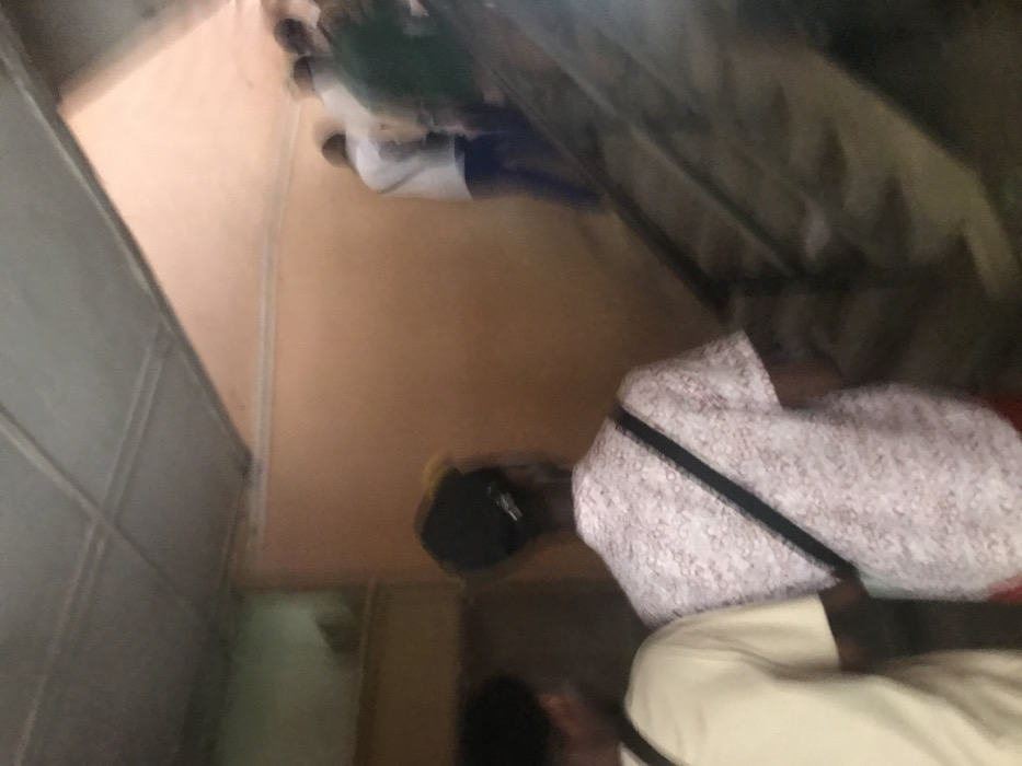The image displays an interior scene in Ihiagwa, Nigeria, capturing multiple individuals in a stairwell or passageway